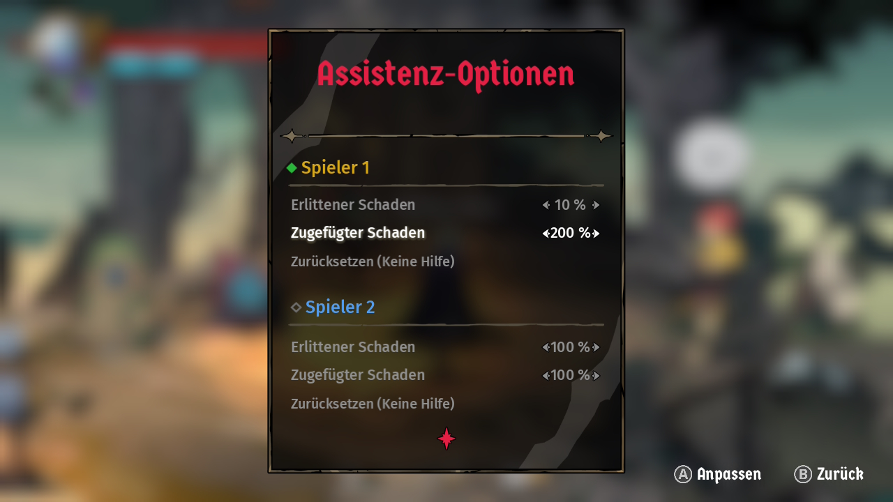 Die Assistenzoptionen sind vorbildlich. Schaden am Gegner sowie eingehender Schaden lassen sich in Zehn Prozent Schritten anpassen, jeweils separat für beide Spieler. Dadurch könnt ihr unterschiedliche Erfahrungsniveaus perfekt ausgleichen.