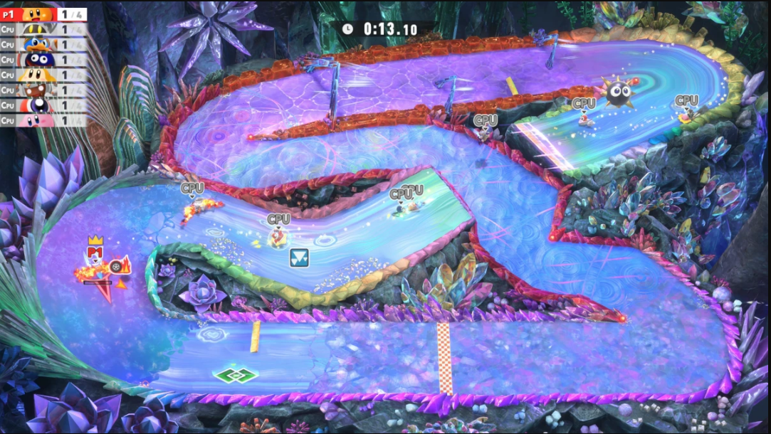 In Top Ride erlebt ihr den Kirby-Rausch von oben. Die Strecken sind kurz, explosiv und mit Perks versehen, die euch brennende Flügel, Eisattacken oder Bomben liefern. Dieser Modus wirkt so herrlich chaotisch, dass er problemlos jede Party auflockert – und dank der Vogelperspektive bleibt er stets übersichtlich.