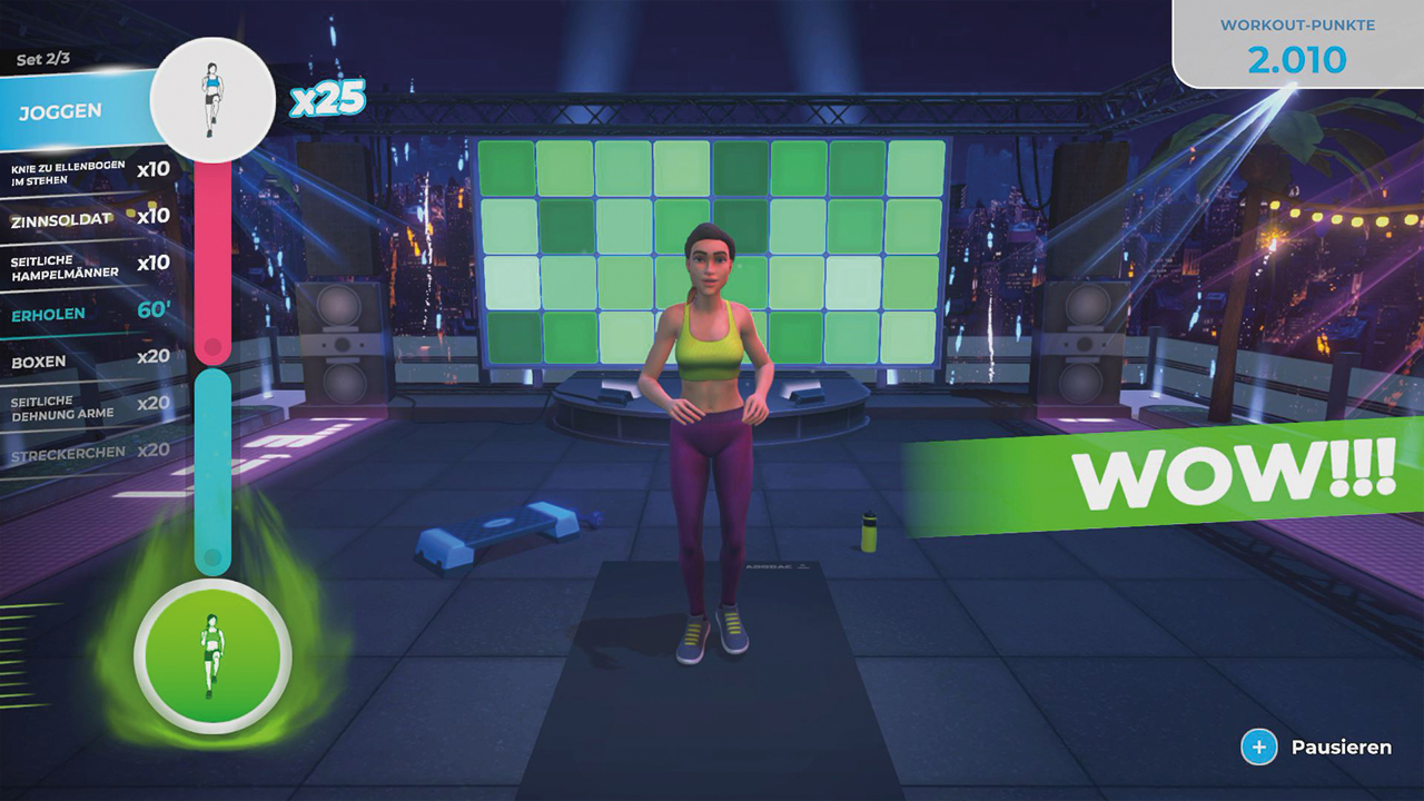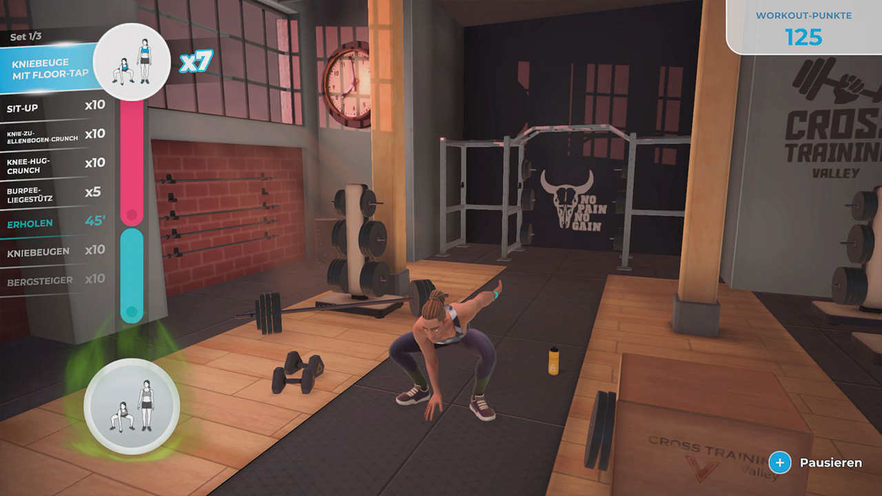 Die Trainings-Zirkel werden zudem mit der Zeit schwerer. Ihr könnt in der Intensität variieren und entsprechend eurer Fortschritte einiges draufpacken. Hier achtet aber bitte auch selbst auf eigene Regenerationsphasen, da das Spiel nicht immer gut genug auf euch aufpasst.