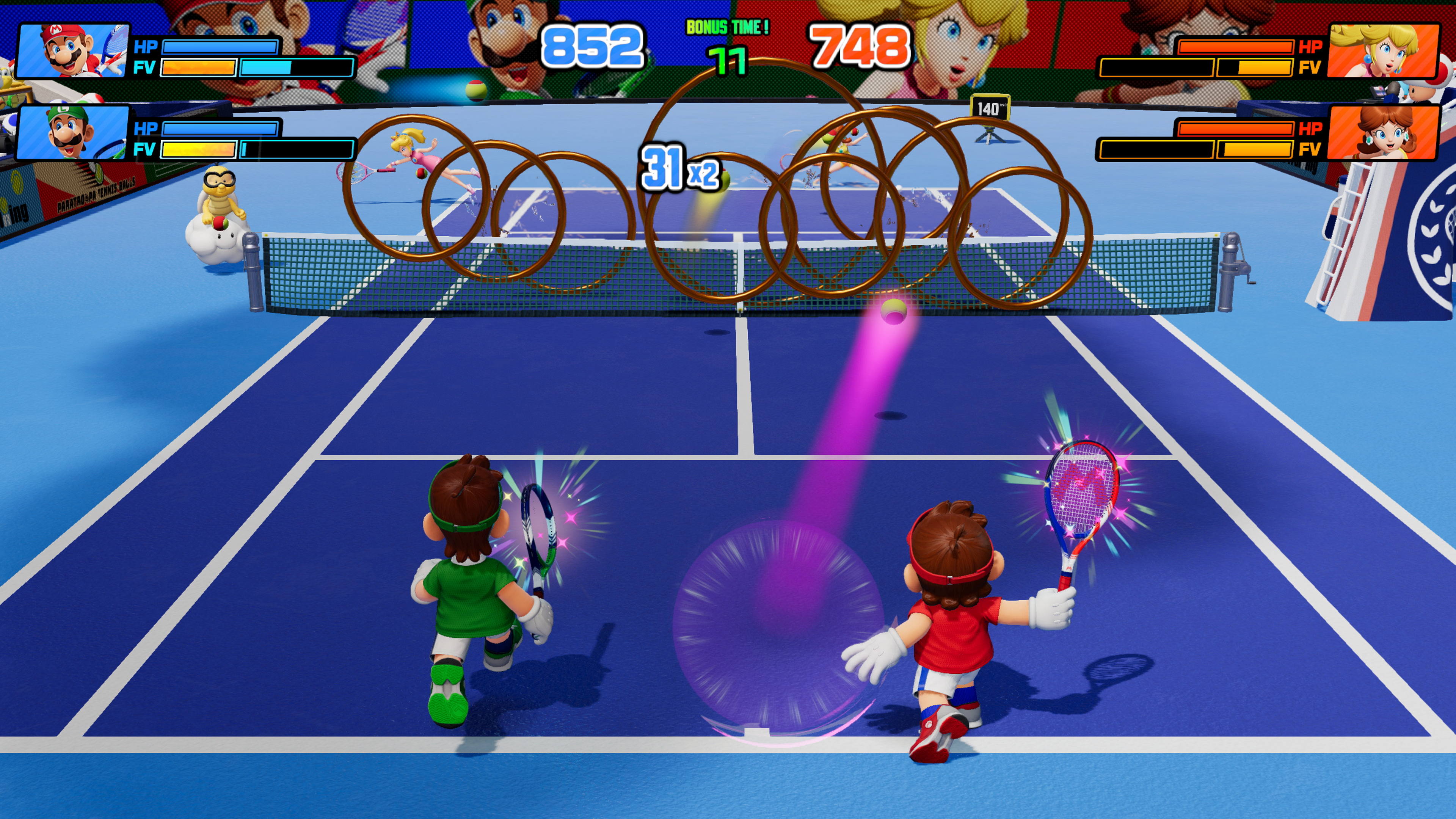 Herzstück von Mario Tennis Fever ist das bewährte, aber deutlich erweiterte Tennissystem. Neben klassischen Schlagarten wie Spin, Slice, Lob und Top Spin oder Stoppball steht vor allem die neue Fever Mechanik im Mittelpunkt. Während der Ballwechsel füllt ihr die gleichnamige Leiste, die euch bei vollständiger Ladung einen spektakulären Fever Schlag ermöglicht. Diese Spezialschläge sind blitzschnell, wuchtig inszeniert und sorgen regelmäßig für überraschende Wendungen.