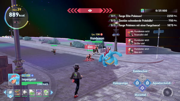 Darüber hinaus trefft ihr in der Dimension auf Pokémon, die in Illumina City zuvor nicht verfügbar waren. Das sorgt für zusätzliche Sammelmotivation und lädt dazu ein, das eigene Team neu zusammenzustellen. Auch Megasplitter und glitzernde Items, darunter zahlreiche Beeren und XP-Items sind en mass zu finden. Da ihr bestenfalls auf Level 100 mit einem hochwertigen Donut in das jeweils zufällige Dimensionsportal eintretet, versucht Gamefreak durch die auffindbaren Items den definitiv gegebenen Grind etwas abzumildern. Trotz der erwähnten Neuerungen bleibt der Umfang der neuen Inhalte insgesamt aber überschaubar und das Balancing der Schwierigkeit gleichzeitig nicht immer ausgewogen.