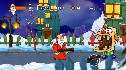 Das Gameplay offenbart sich dabei als relativ simpel: Marschiert von links nach rechts, räumt die ganzen Gegnerwellen aus dem Weg und verdient euch so etwas Geld. Mit den gesammelten Moneten könnt ihr im Shop euer Waffenarsenal um mächtigere Wummen erweitern und den Munitionsvorrat aufstocken. Patronen erhaltet ihr gelegentlich auch von erledigten Gegnern, ebenso wie Spritzen, die Santas Energieleiste wieder auffrischen.