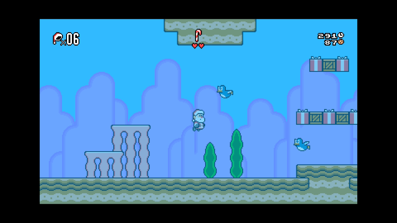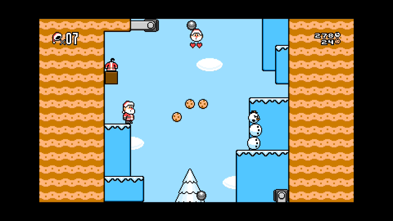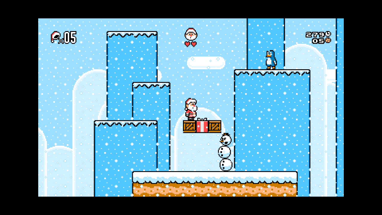 Und dies tut er in Form eines klassischen 2D-Jump n’Runs, das bereits in den ersten Sekunden keinen Hehl daraus macht, ordentlich bei den alten Mario-Plattformern abzukupfern. Santa läuft von links nach rechts, beseitigt Gegner wie Pinguine oder Schneemänner durch Sprünge auf den Kopf, zerbricht Kisten indem er dagegen hüpft oder entlockt Geschenken verschiedene PowerUps.