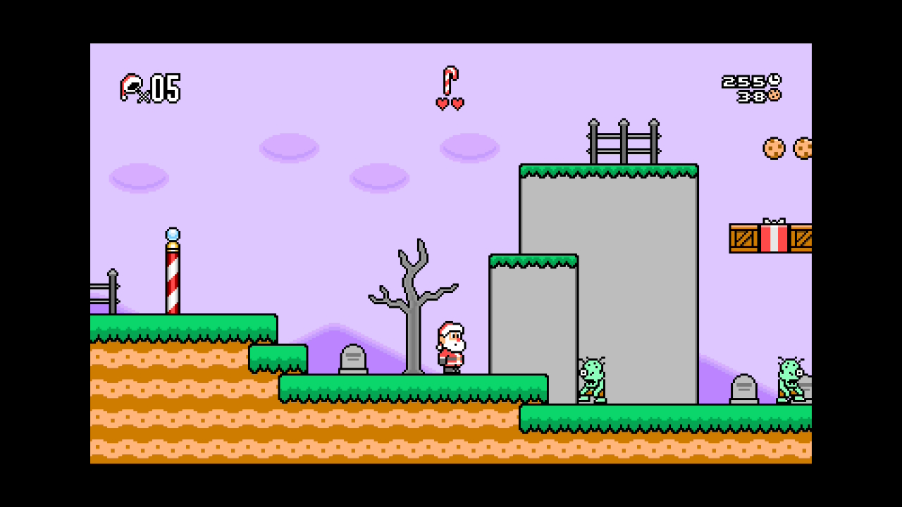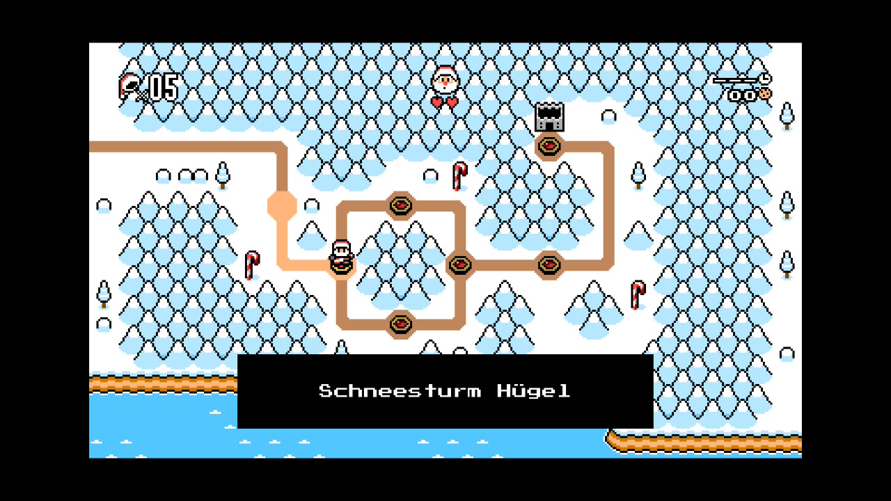 Auch die Levels selber bieten durchaus Abwechslung. Neben bewährten Hüpfabschnitten, winken auch Stages mit Autoscrolling oder Abstecher unter Wasser. Am Ende einer Welt wartet jeweils ein Obermotz in einem Schloss auf Santa. Diese Kämpfe erweisen sich teils allerdings als recht frustrierend. Die Angriffsmuster des Obermotz sind komplett zufällig und erlauben kein wirklich taktisches Vorgehen. Da kann schon mal das eine oder andere Leben draufgehen. Sind diese komplett aufgebraucht, heißt es unweigerlich Game Over, was. Optisch präsentiert sich The Legend of Santa (nicht zu verwechseln mit «Zelda») in einem charmantem Pixellook, der sich ebenfalls die eine oder andere Inspiration von Super Mario World geholt hat. Die Sprites sind hübsch animiert und gefallen mit ihren Details. Musikalisch werdet ihr unter anderem von Weihnachtslieder im Chiptune-Format begleitet, die stets zur Umgebung passend arrangiert wurden.