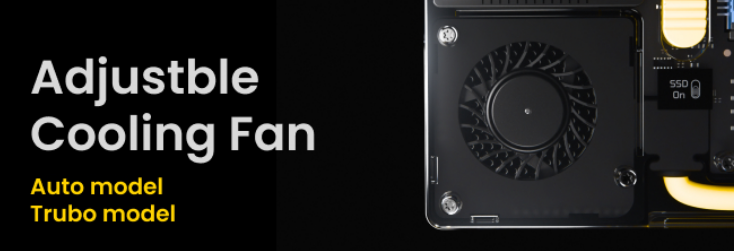 Außerdem verfügt die Disk Pro über einen aktiv kühlenden Lüfter, der per Knopfdruck inkl. LED eingeschaltet werden kann. Sonst befindet er sich im automatischen Modus und wird aktiv, sobald die Disk Pro über 30 Grad Celsius warm wird.