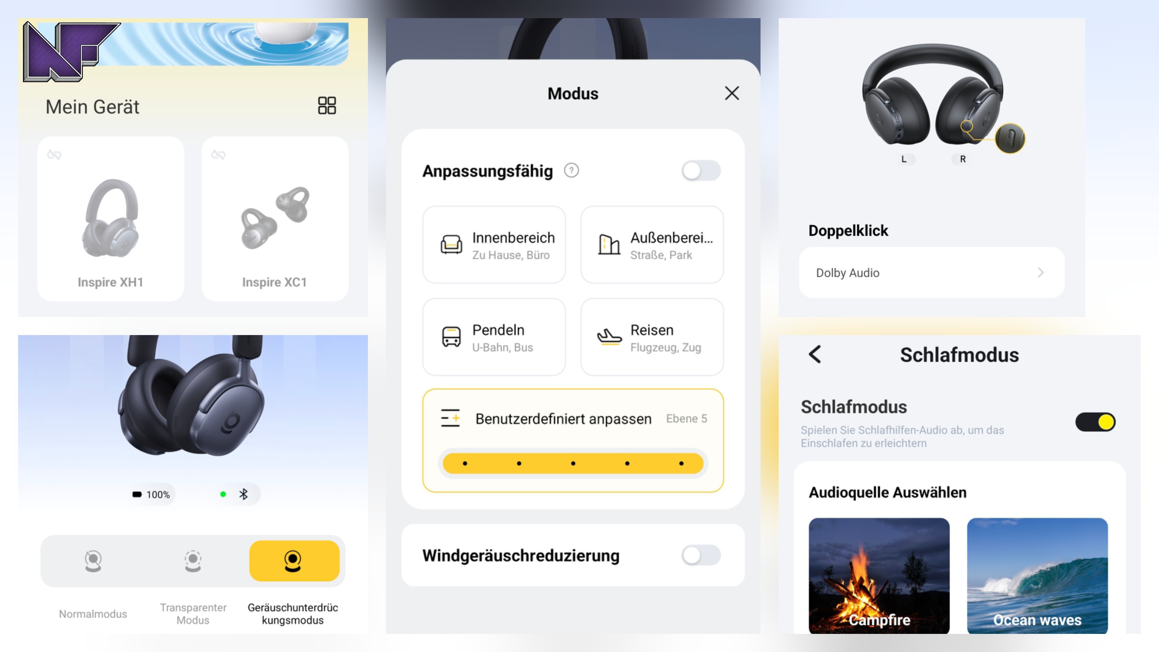 Der XH1 stellt die Spitze der Inspire-Serie dar: 35-mm-Treiber, Hi-Res Audio, LDAC, AAC, SBC, Sound by Bose, Dolby Audio, Premium Adaptive ANC (bis zu -48 dB), Bluetooth 6.1, AUX-Betrieb, bis zu 100 Stunden Akkulaufzeit durch verbaute 800 mAh (bei ausgeschaltetem ANC und 50% Lautstärke) und ein ergonomisches Over-Ear-Konzept. Die Latenz liegt bei 80ms. Das ANC ist beim XH1 noch etwas umfangreicher als beim XP1. Denn hier habt ihr neben dem normalen (deaktivierten) ANC-Modus und dem Transparenzmodus, bei dem die Mikrofone durchlässig geschaltet sind, auch den Modus zur Geräuschunterdrückung dabei, der über mehr Konfigurationsdetails verfügt. Ihr könnt Neben Innen- und Außenumgebungen, auch über die bereits bekannte Pendel-Option und nun auch die Reise-Funktion (Flugzeug) verfügen. Alle Noise Cancelling Konfigurationen lassen sich zudem benutzerdefinieren und erlauben bis zu fünf Ebenen der Geräuschunterdrückung. Ein zusätzlicher Switch kann aktiviert werden um die Windgeräuschreduzierung zu verbessern.