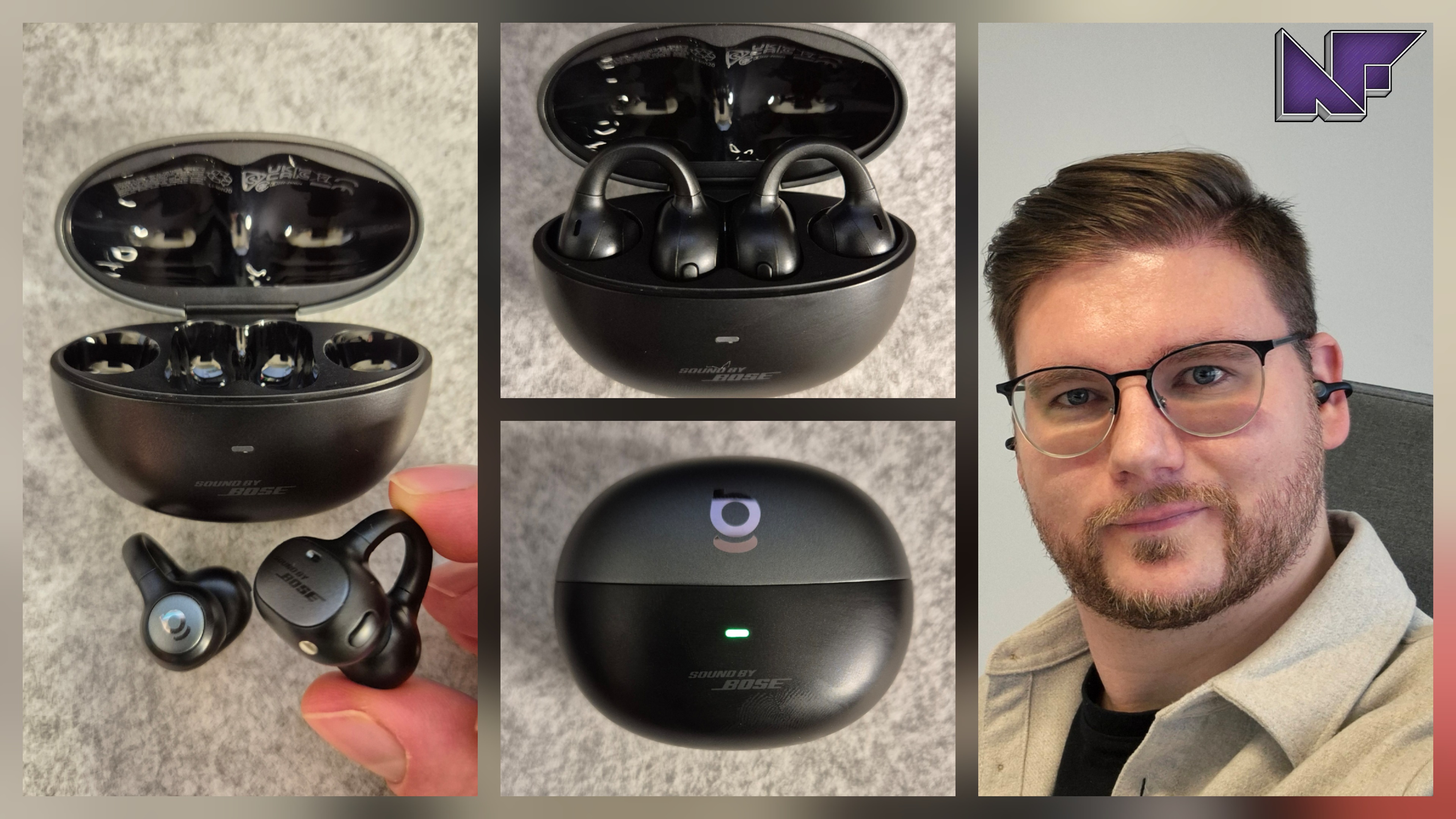 Das enthaltene Ladeetui wirkt solide, der Mix aus mattem und glänzendem Finish ist edel und der Schließmechanismus sauber verarbeitet. Auch der Baseus-Schriftzug auf der einen Seite und das Logo auf der anderen wirken nicht aufgesetzt, sondern stimmig integriert. Die Zweifarbigkeit des Cases (schwarz-grau) wird außerdem dafür genutzt, den „sound by Bose“ dezent darzustellen. Klappt ihr das Ladecase auf, um die Open-Ears zu entnehmen, leuchtet eine LED. Je nach Lade- und Verbindungsstatus passt sie sich bei ihrer Indikation an.