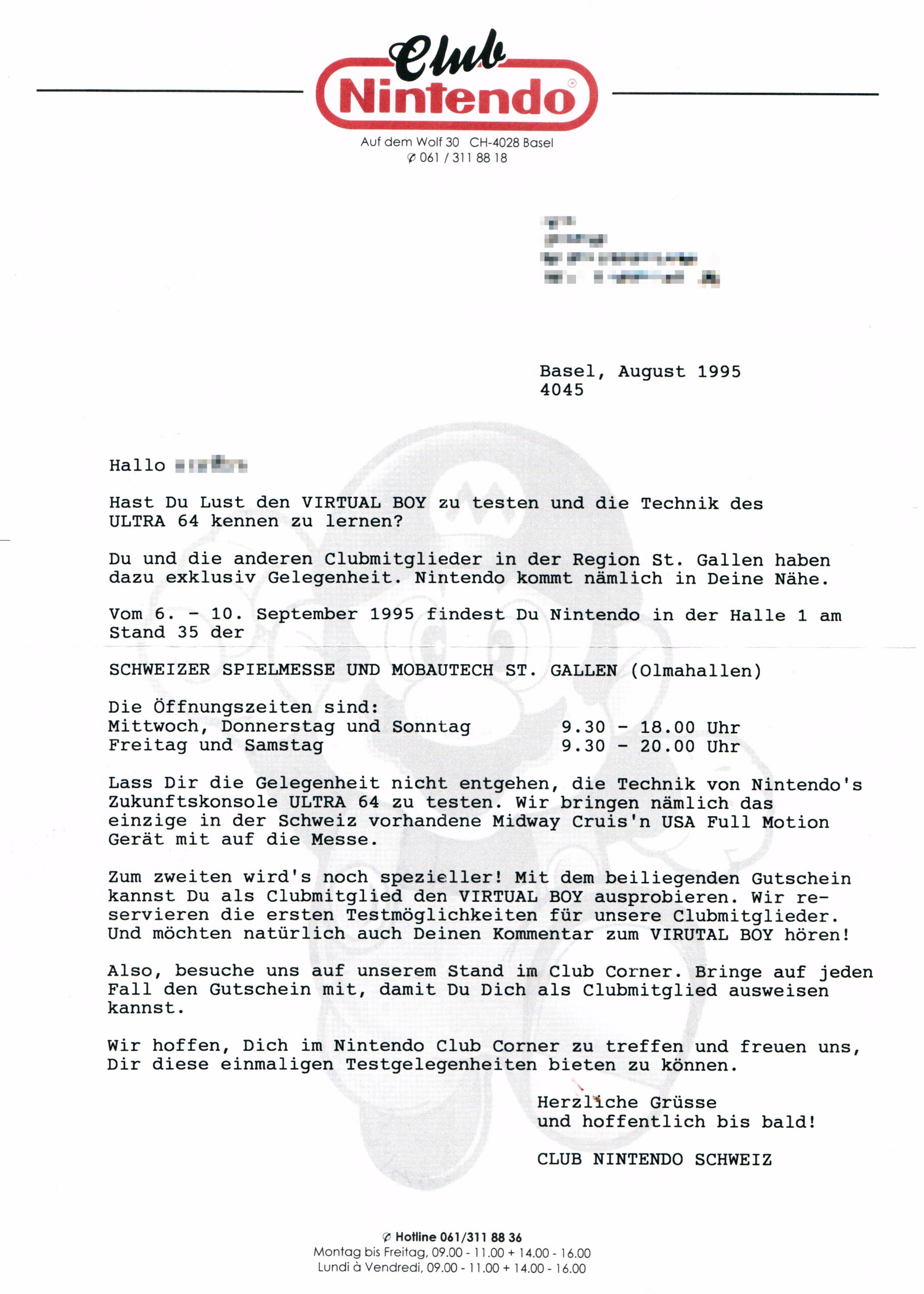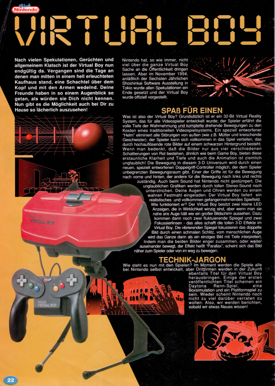 Zu einem Release in Europa hielt sich Nintendo mit Informationen zurück. Hoffnung machte Nintendos Auftritt an der Schweizer Spielmesse und Mobautech Anfang September 1995 in St. Gallen. Der Virtual Boy wurde vorgestellt und Club Nintendo Mitglieder aus der Region erhielten exklusiv die Möglichkeit das neue System in einem abgetrennten Bereich auszuprobieren. Eine Nachfrage bezüglich der Veröffentlichung wurde mit Anfang 1996 beantwortet. Doch daraus wurde bekanntlich nichts, es sollte auch die einzige öffentliche Präsentation des Virtual Boys in Europa bleiben (mehr dazu unter https://seppatoni.ch/virtual-boy/)
