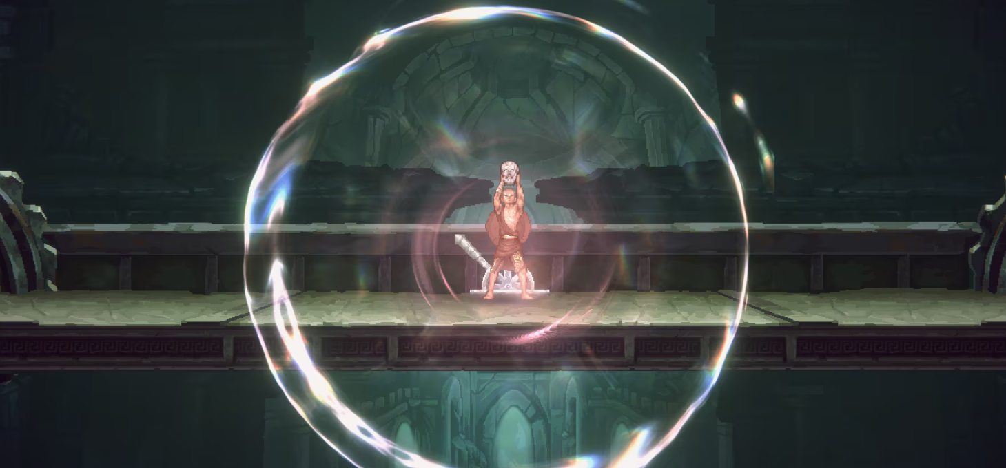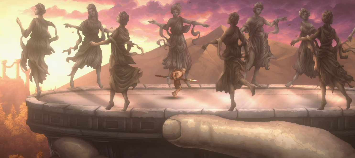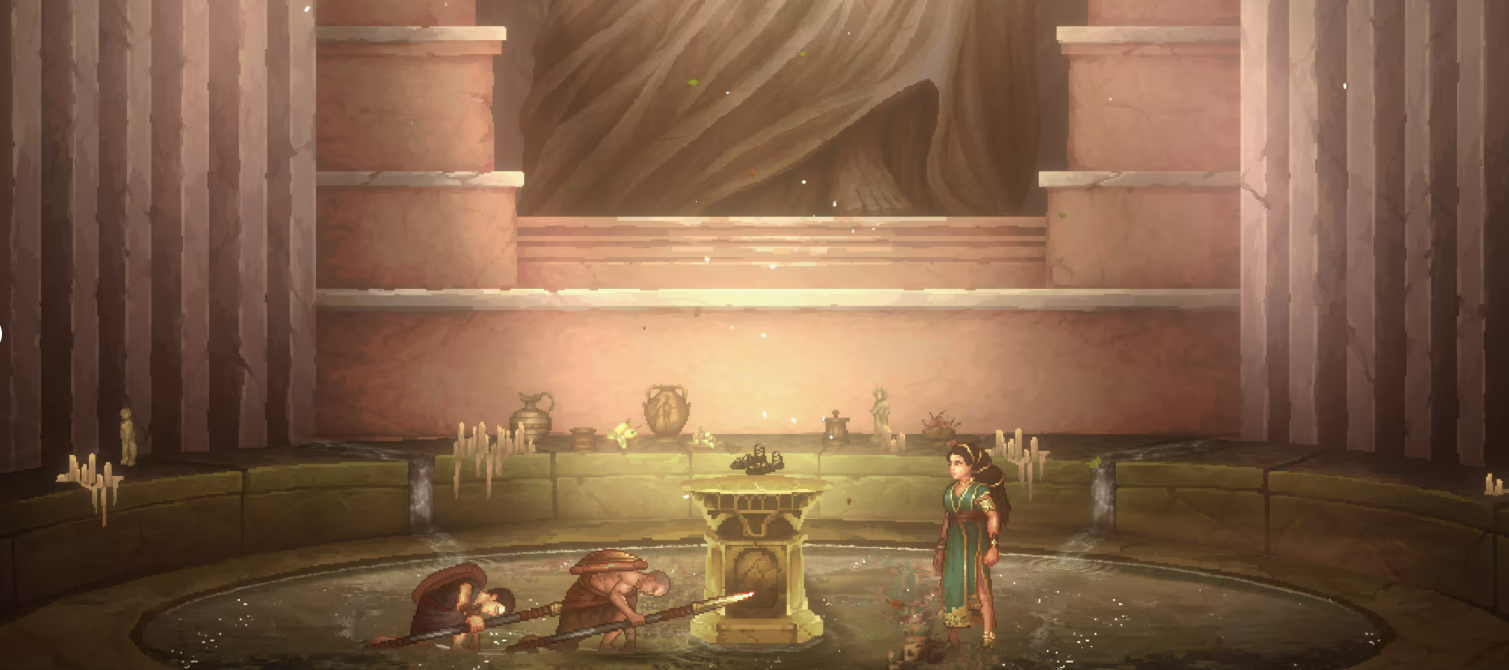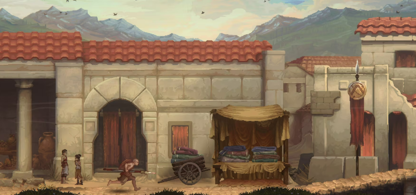Designtechnisch wagt Mad Cat Games mit Sons of Sparta einen Versuch, der nicht immer auf göttliches Wohlwollen stößt. So wirken die griechisch und mythologisch inszenierten Bereiche, besonders die Hintergründe, stimmungsvoll und überzeugend, werden aber in einen 2D-Pixellook mit Aquarell-Stil eingebettet, der oft zu blass wirkt, um dem mächtigen God of War Franchise gerecht zu werden. Generell fehlt vielerorts die visuelle Identifikation mit dem später so starken Charakter Kratos. Zwar erlebt ihr in den Beziehungen zu NPCs und Göttern einiges, die audio-visuelle Präsentation des Charakters bleibt jedoch durchwachsen.