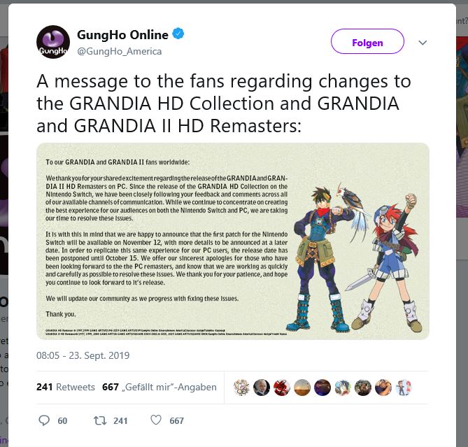 Auf Twitter wurde von GungHo bekanntgegeben, dass Grandia HD Collection ein Update erhalten soll, in welchem Fehler gepatcht werden und auch auf Wünsche der Spieler eingegangen werden soll.