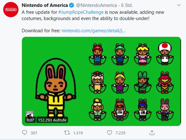 Nintendo hat ein kostenloses Update für Jump Rope Challenge zur Verfügung gestellt. Es wurden neue Kostüme, Hintergründe und sogar die Möglichkeit für ein "Double-Under" hinzugefügt. Mit dem Double-Under könnt Ihr nun testen, ob Ihr das Seil zwei Mal unter eure Füße bekommt, während Ihr nur einmal springt.