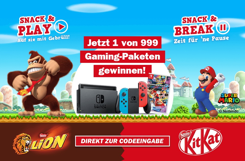 Nintendo und Nestlé haben sich entschieden, eine Kooperation einzugehen. Wenn ihr ab sofort ein Aktionspack von KitKat oder Lion kauft, welches gebrandet ist, könnt ihr mit etwas Glück und bei Eingabe eines Aktionscodes ein Gaming-Set von Nintendo gewinnen, das garantiert ordentlich Spielspaß verspricht. Sicherlich lecker für all jene, die noch keine Switch haben, ihr Glück herausfordern oder anderen eine Freude machen wollen.