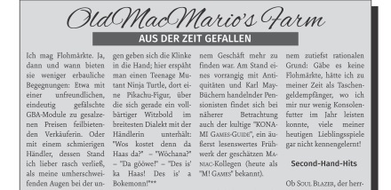 Neben den Reviews finden sich auch kleinere News, Gags und Kolumnen, die ebenfalls sehr interessant gestaltet sind. So stellt Lukas sich und sein Magazin in Ausgabe 1 kurz vor und sinniert im weiteren Verlauf u.a. über DLCs und Flohmärkte; außerdem gibt er in Bezug auf letztere auch Hinweise, wie man an die in der Rubrik „Gestern“ vorgestellten Spiele gelangt.
