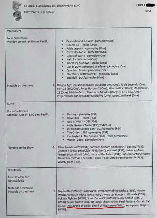 Vor kurzem wurde ein Manifest geleaked, auf dem anscheinend das spielbare E3 Line-Up aller Konsolenhersteller, unter anderem von Nintendo zu sehen ist. Das überraschendste dabei ist wohl, das vor allem für die Wii U ein Spiel mit dem Namen The Legend of Zelda: Shard of Nightmare gelistet ist. Die Zeit bis Juni wird also von Tag zu Tag spannender, immerhin handelt es sich noch um ein Gerücht.